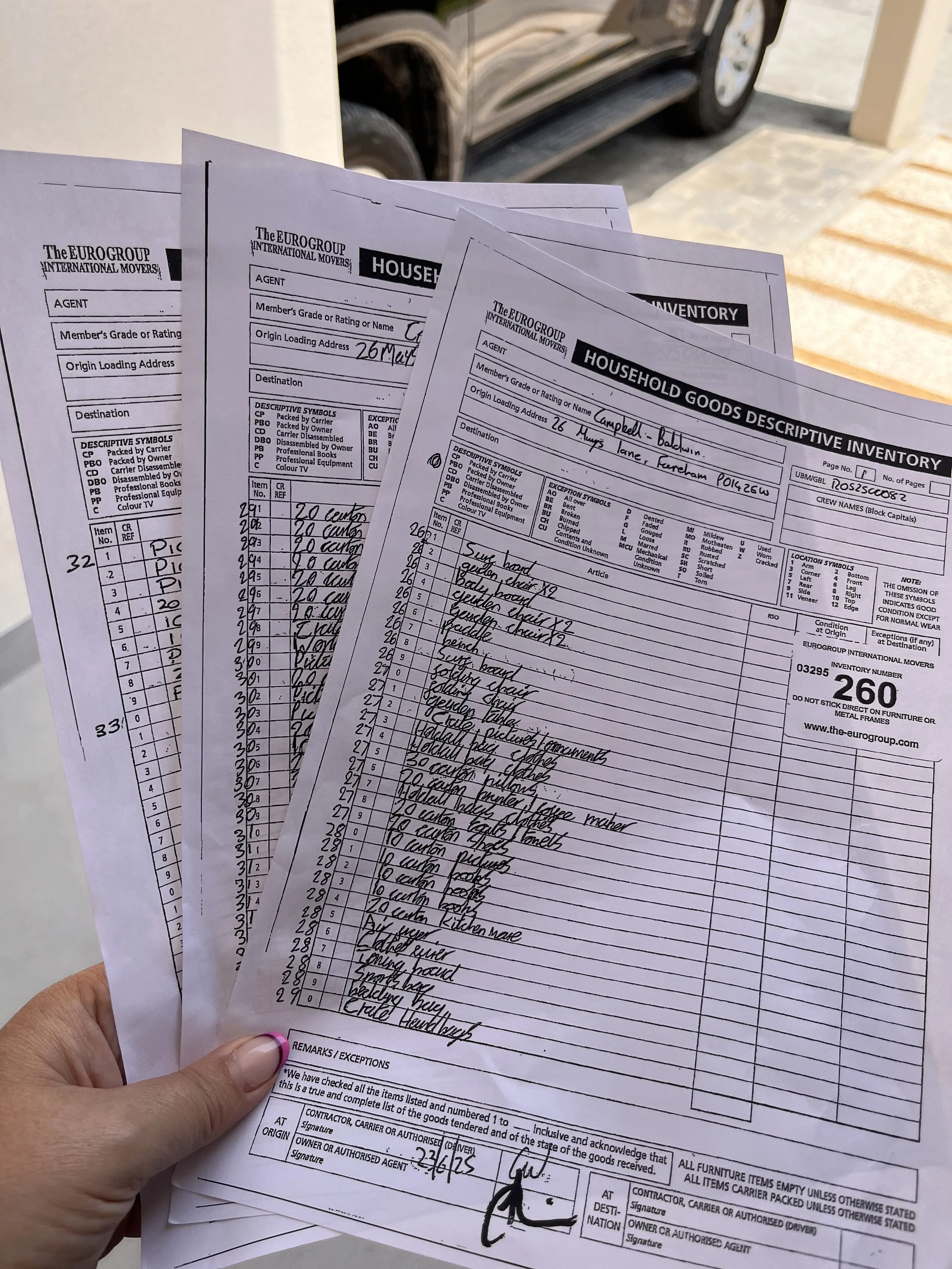 Every single item — from kitchen utensils to kids’ toys — had to be listed on a Household Goods Descriptive Inventory form. These documents are essential for customs clearance on arrival in Oman. You’ll need similar paperwork regardless of who ships your items, and it’s worth double-checking: