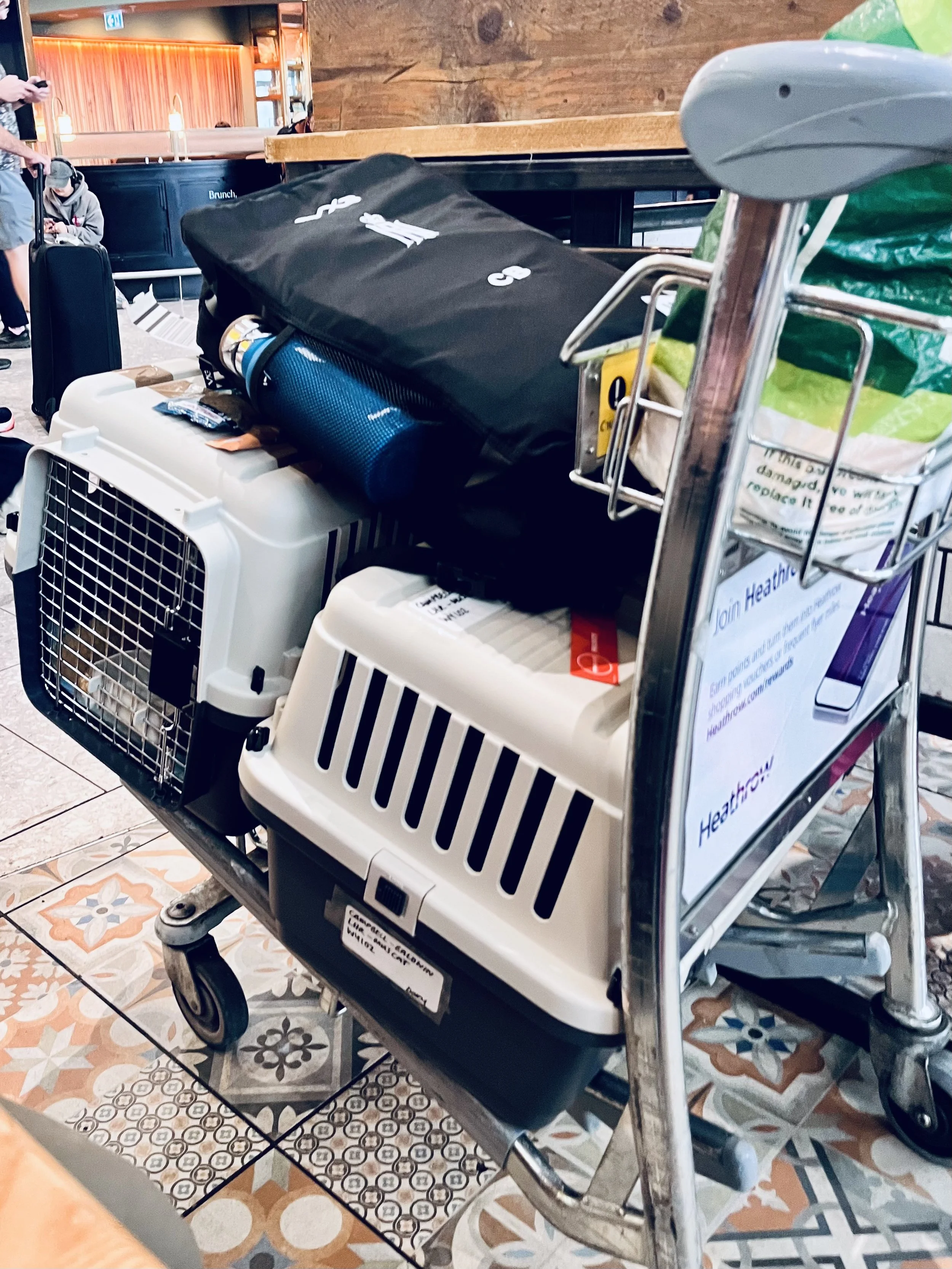 We lined the crates with three layers — vet bed, puppy pads, and an old towel — just in case. That decision turned out to be a stroke of genius, because minutes before takeoff, Flash decided to test the system by having an accident right there in Heathrow! A quick clean-up later and we were back on track — proof that a little over-preparation goes a long way.